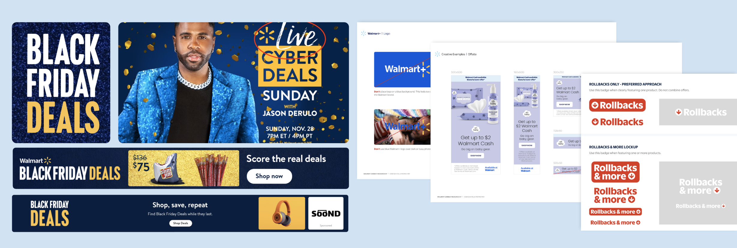 In partnership with Walmart Creative Studio, I led the "translation" of Walmart’s massive seasonal visual identities for the advertising ecosystem. We took the high-level Enterprise design language—for moments like Holiday or Back to School—and adapted it into advertiser-ready frameworks. This allowed suppliers to align their creative with Walmart’s macro campaigns, leveraging the retailer's brand equity while maintaining their own unique presence.